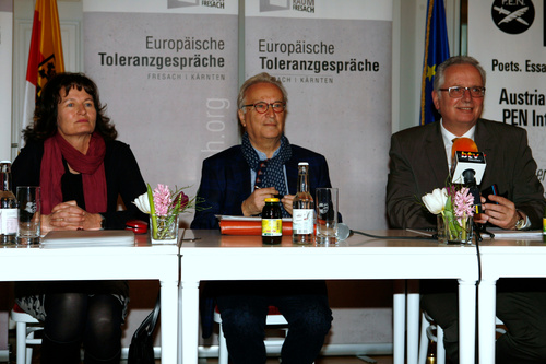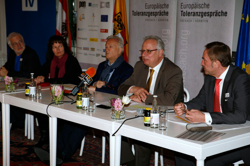 (Klagenfurt )  Im Spiegelsaal der Kärntner Landesregierung präsentierten die Organisatoren der Europäischen Toleranzgespräche am Dienstag abend das Programm 2016. "Die Grenzen Europas - Menschenrechte und die Folgen des Klimawandels" stehen im Mittelpunkt des Dialogforums, das vom 11. bis 14. Mai 2016 im Kärntner Bergdorf Fresach stattfindet. "Mehr als 50 Dichter und Denker, Wissenschafterinnen und Ökonomen nehmen an der Veranstaltung teil", informierte Denk.Raum.Fresach-Präsident Hannes Swoboda über das Programm. Mit dabei Villachs Bürgermeister Günther Albel und Landtagspräsident Reinhart Rohr.