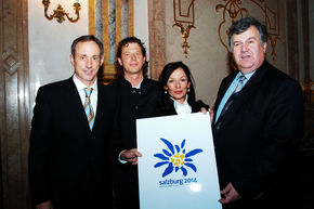 Salzburgs Olympia-Werber zeigen Aktivität: Im Schloss Mirabell präsentierten Salzburgs Olympia-Werber heute das neue Logo für die Kandidatur. Das Edelweiß mit den fünf Kontinenten in der Mitte soll als Einladung an die ganze Welt verstanden werden.
