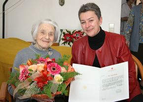 Die Bezirksseniorenbeauftragte Meidling GR Gabriele Mörk durfte in der Kursana Residenz Wien-Tivoli Frau Johanna Hilger zum 102. Geburtstag gratulieren. Neben vielen Glückwünschen bekam die betagte Dame auch eine Urkunde von Bürgermeister Dr. Michael Häupl. Ihre Schwester Michaela Weiner feiert in Kürze ebenfalls Geburtstag - sie wird im März 98 Jahre alt. Die Kursana Residenz Wien-Tivoli ist eine Seniorenresidenz mit Appartments mit Betreuung und befindet sich in unmittelbarer Nähe von Schönbrunn, mitten im Grünen und doch in der Stadt.