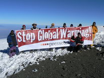 "Schnee am Kilimandscharo" ist eine der berühmtesten Kurzgeschichten des amerikanischen Autors Ernest Hemingway. Doch die kilometerweit sichtbare Gletscherkappe am höchsten Berg Afrikas ist bedroht. Nur noch wenige Jahrzehnte wird der an der Grenze zwischen Tansania und Kenia 3° südlich des Äquators gelegene Kilimandscharo sein Schneekleid behalten, warnen Klimaexperten und Geowissenschafter. Mitarbeiter und Freunde der Nachrichtenagentur pressetext haben vergangene Woche auf dem 5.895 m hohen Gipfel eine Aktion gegen die zunehmende Klimaerwärmung gestartet - Ziel ist es, mit vermehrter Berichterstattung über Ursachen und Auswege zu informieren.