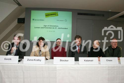 Beschreibung: "Age of Simulation. Lernen und Forschen im 21. Jahrhundert", Pressegespräch. Bild v.l.: Ludovit Garzik (GF Rat für Forschung und Technologieentwicklung), Gabriele Zuna-Kratky (Technisches Museum Wien, Mitglied des Rats für Forschung und Technologieentwicklung), Gerfried Stocker (Künstlerischer Leiter der Ars Electronica, Linz), Harald Katzmair (FAS. research, Wien/San Francisco), Ivan Chase (Associate Professor at the Department of Sociology and Graduate Program in Ecology and Evolution, Stony Brook University) und Don Steiny (President of the Institute for Social network Analysis of the Economy, member of the Silicon Valley Network Analysis Project). Foto: Anna Rauchenberger, am 10.01.2006