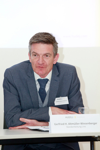 Beschreibung: Unternehmensgründer Gerhard Hudej sowie die Standortleiter in Wien, Graz, Salzburg und Linz präsentierten die neuesten Entwicklungen am österreichischen Zinshausmarkt. Im Bild: Gerfried H. Altmüller-Wiesenberger (Standorteitung Linz)