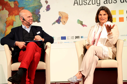 Beschreibung: Die zwei Toleranzforen am Nachmittag waren den zwei Institutionen Kirche und Staat und ihren Aufgabenstellungen gewidmet. Im Bild von links nach rechts: Chefredakteur Claus Reitan und Psychotherapeutin Boglarka Hadinger vom Viktor Frankl Institut.