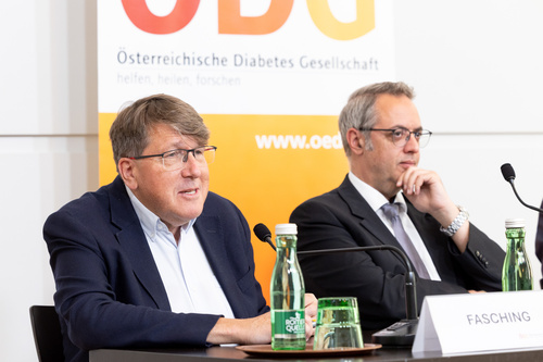 Beschreibung: (c) fotodienst / Anna Rauchenberger - Wien, am 17.06.2025 - Österreichische Diabetes Gesellschaft (ÖDG) - Prävention und Früherkennung von Diabetes mellitus Wie steht es um Österreich? - Pressegespräch im Presseclub Concordia. FOTO v.l.: Prim. Univ.-Prof. MR Dr. Peter Fasching, MBA, Präsident der ÖDG, Wien, Univ.-Prof. Dr. Harald Sourij, MBA, Stellvertretender Vorsitzender der ÖDG, Graz: